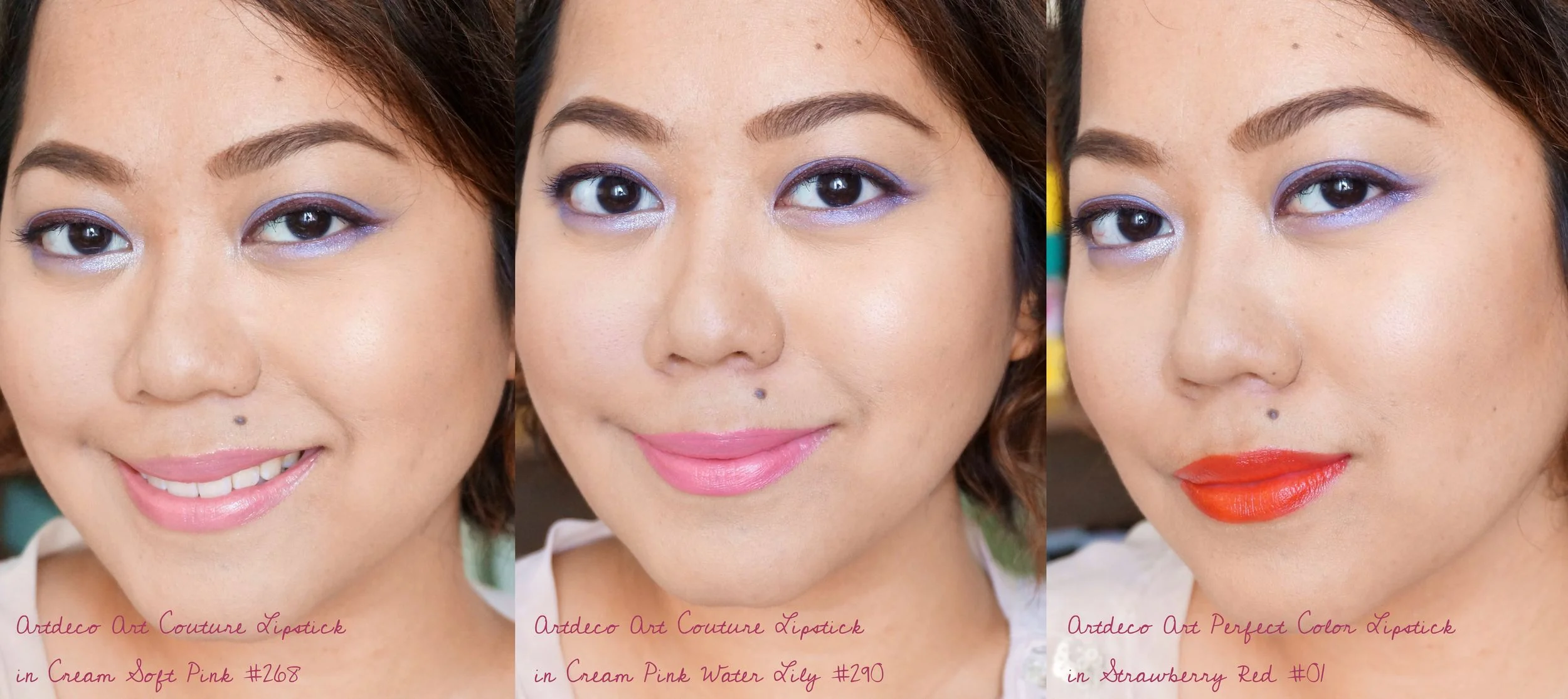 I've got swatches for three: the Art Couture Lipstick in Cream Soft Pink #268 (left most) is a nice daily color. It's still pastel, not quite MLBB, but it's wearable even on my medium skin. The Perfect Color Lipstick in #91A Soft Pink (middle) is my favorite - it's a gorgeous mid-toned pink that brightens my face instantly! The Perfect Color Lipstick in Strawberry Red #01 looks surprisingly orange-y on my skin tone. It's a great summer red that doesn't bleed and when it fades, it leaves an even stain.