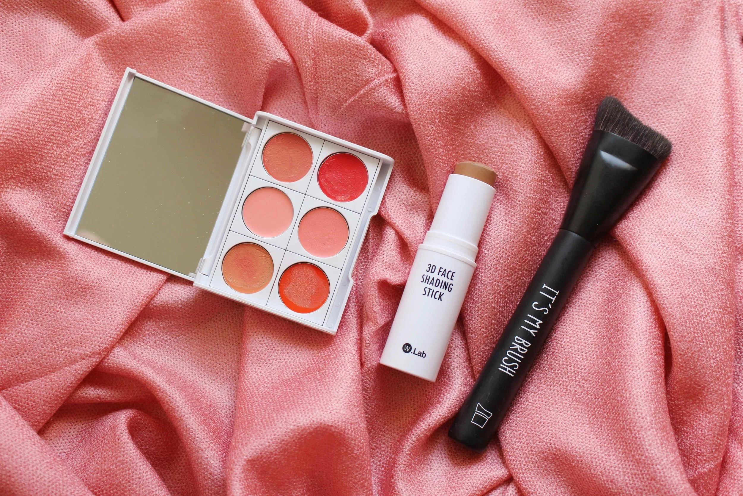 After doing my base and eyebrows, I applied the W-Lab 3D Face Shading Stick (P600) as a normal contour and as the base color for my forehead and nose. Then I added some peach from the W-Lab Flower and Lip Cheek Kit (P730) to the contour to sort of warm it up more. I blended everything together with the It's My Carve Foundation Brush (P180). Later on, after the brownish red area has dried, I patted an orange red from the W-Lab palette to intensify the color.