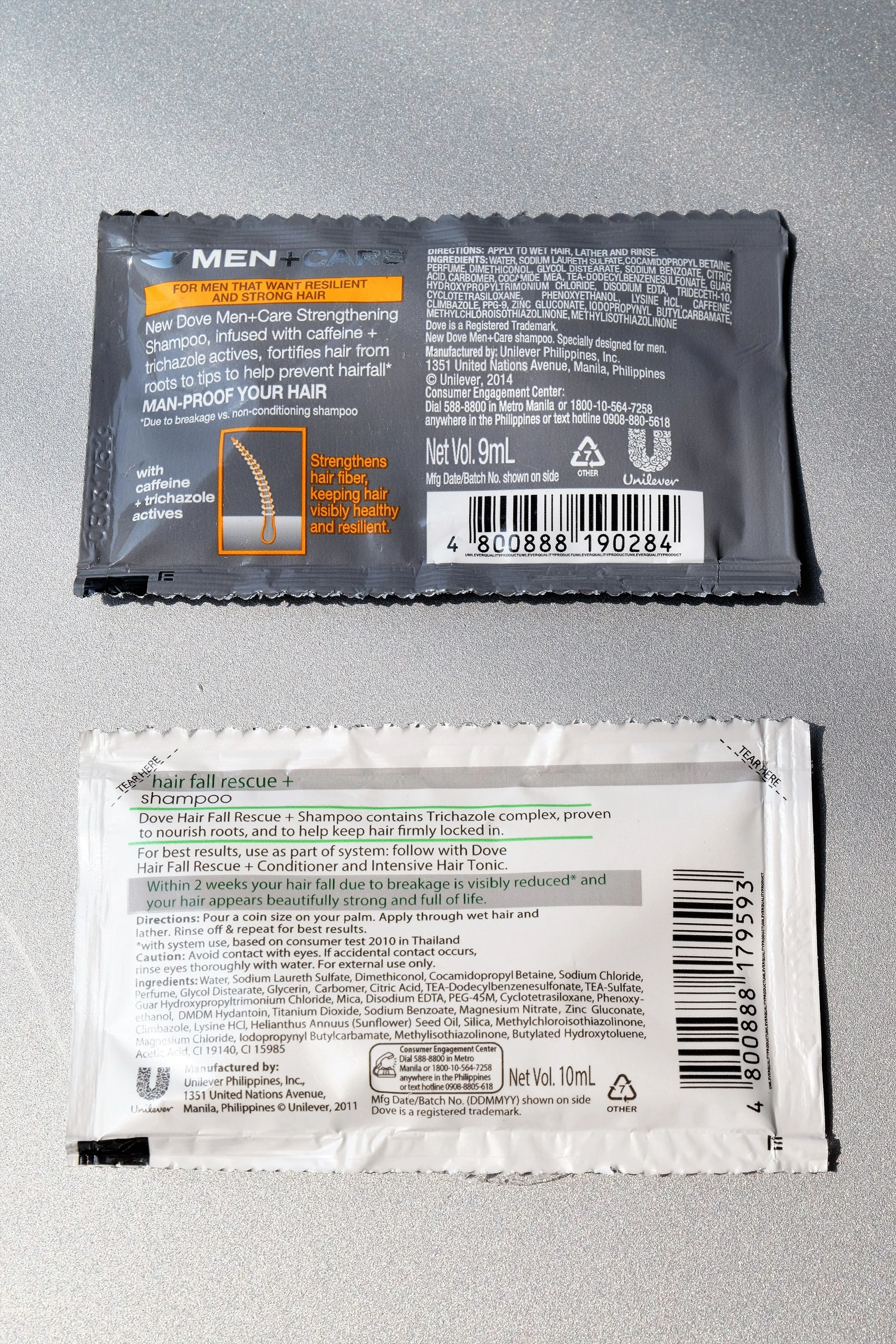 What I found slightly disturbing was the message each one sends. Dove Hair Therapy clearly says on its bottom front, “Love your hair,” while its masculine equivalent declares “Man-proof your hair" on the back panel. What is Dove trying to say here? That man-proofing is the same as loving your hair? Or that women should love and men should “man-proof,” whatever that means? In terms of content and pricing though, Dove Hair Therapy has the upper hand: it contains 10mL, 1mL more than Dove Men+Care shampoo. It’s also cheaper at P4.75 per sachet compared to P5.25. Huh. Curiouser and curiouser.
