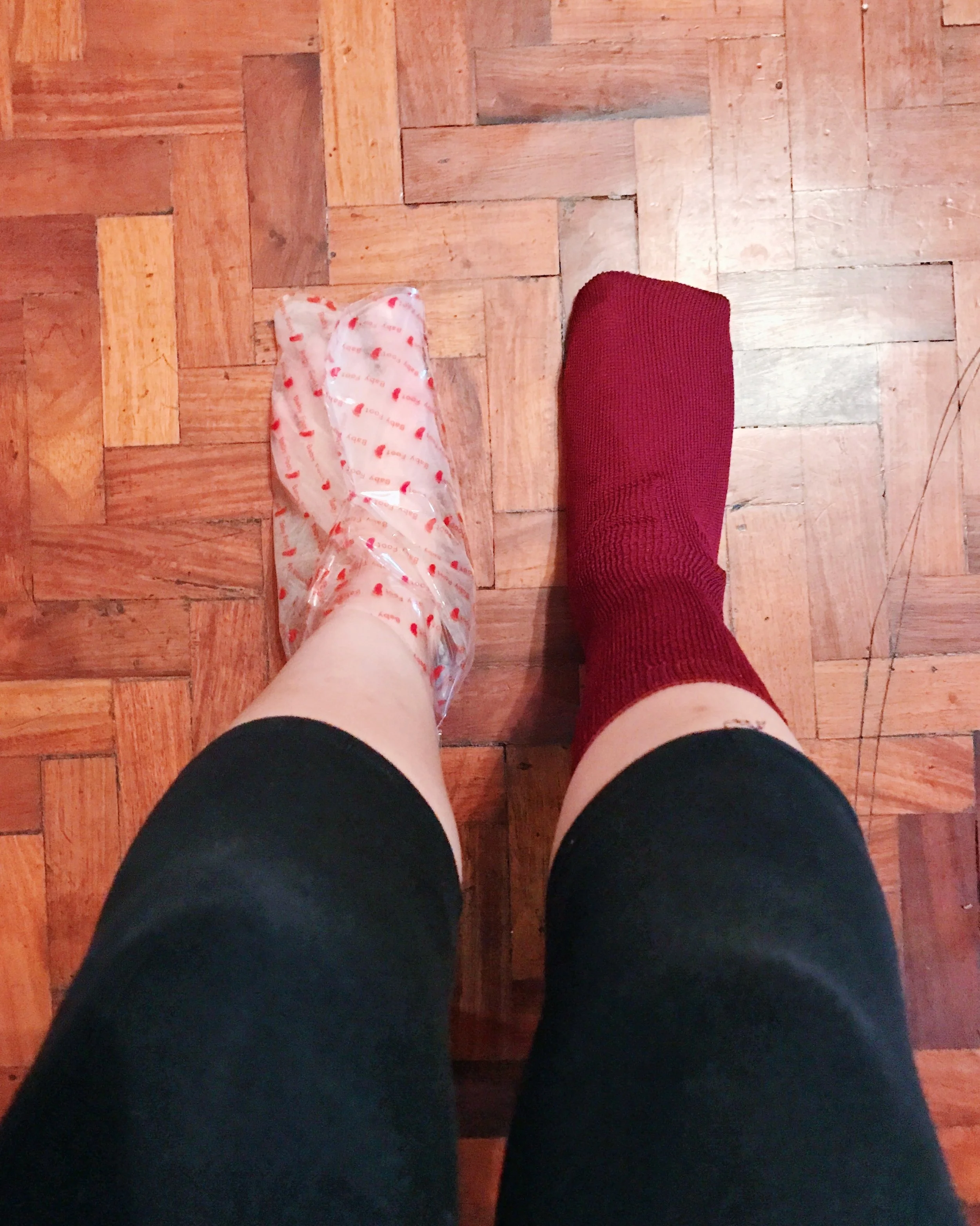 While using the product is technically as simple as putting the foot masks on and allowing them to soak, there are tips for getting the best results possible. Before masking, I cleaned my feet and let them just soak in plain water for 15 minutes before drying them off. This is supposed to help your feet absorb the fruit enzymes of the mask better.